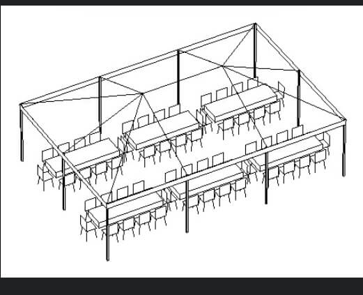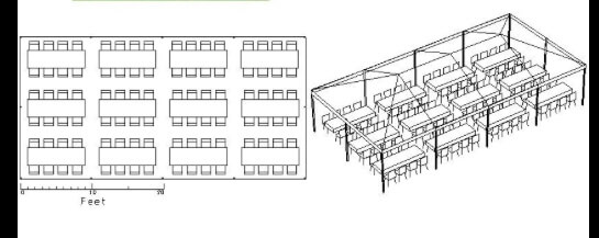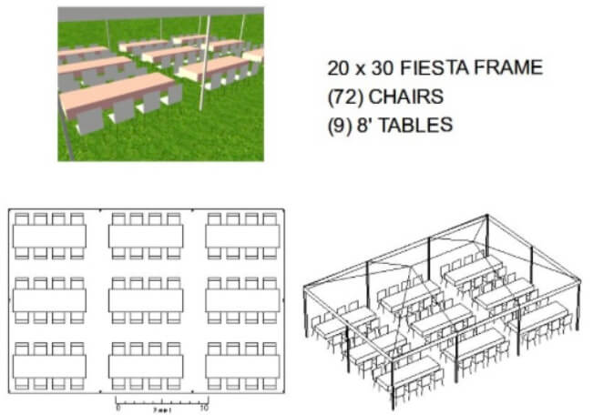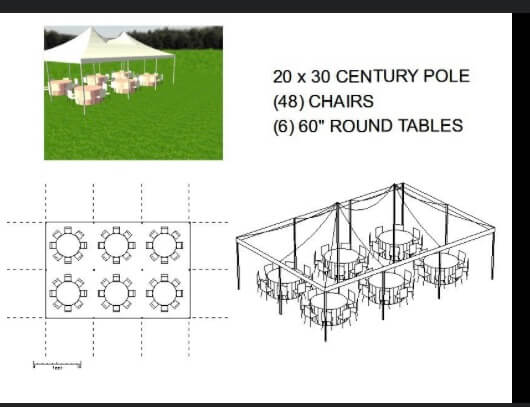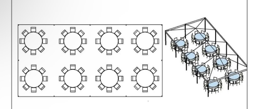 this tent can accommodate up to 60-70 guests Seating 8/60” table is comfortable seating Seating 10/60” table is intimate seating The price depends how you want your package and we have rectangular table 8 ft for 10-8 guests